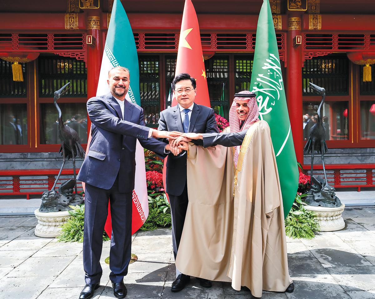 State Councilor and Foreign Minister Qin Gang (center), Iranian Foreign Minister Hossein Amir-Abdollahian (left) and Saudi Arabian Foreign Minister Prince Faisal bin Farhan Al Saud shake hands during a meeting in Beijing on Thursday. DING LIN / XINHUA