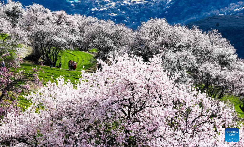 Tourists have fun among peach blossoms in Suosong Village in Nyingchi, southwest China's Tibet Autonomous Region, April 5, 2023. (Xinhua/Jiang Fan)