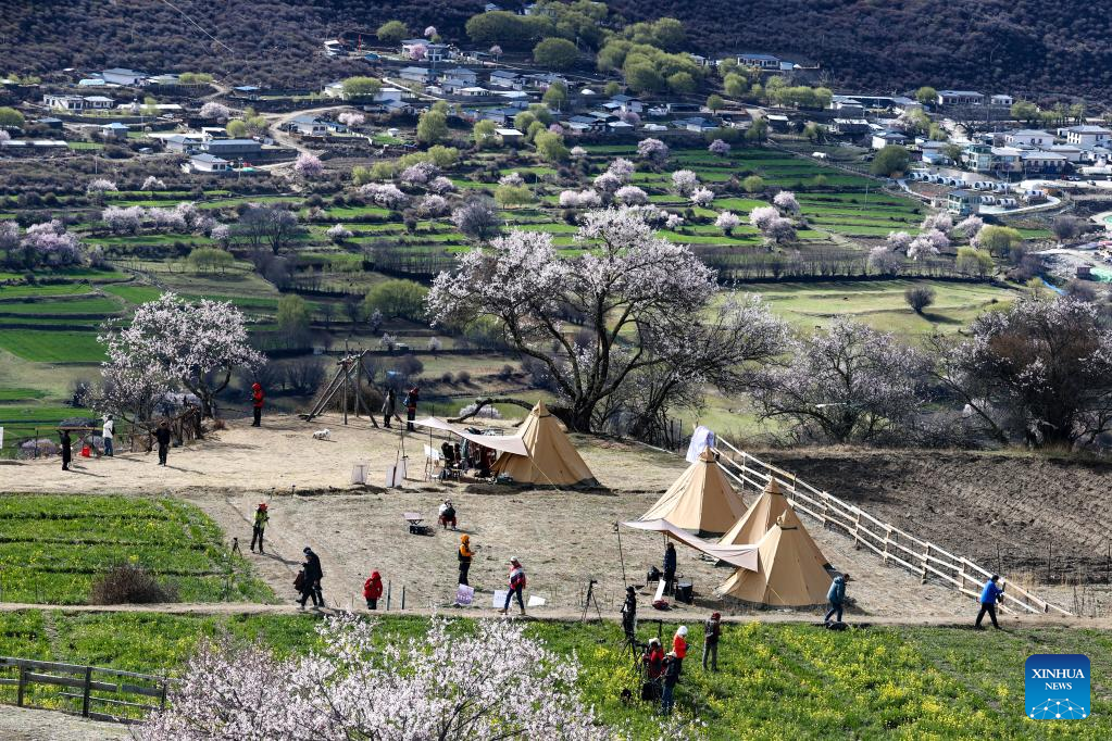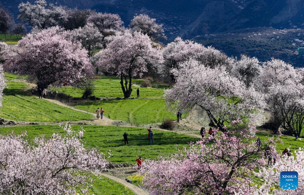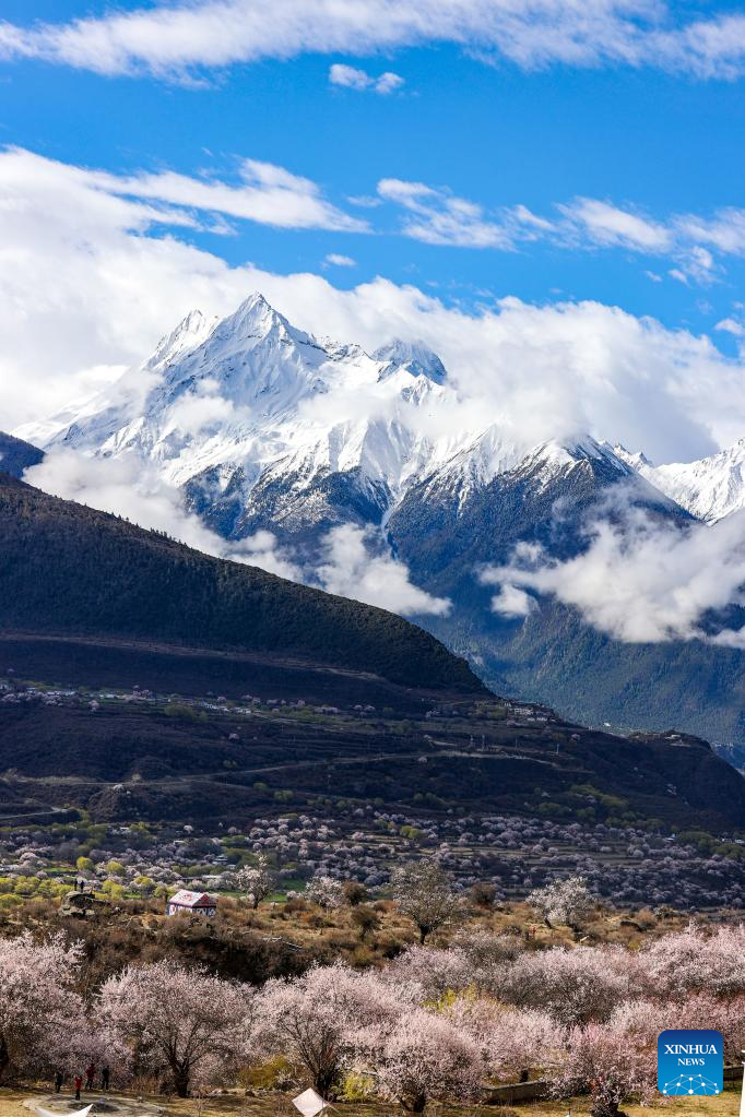This photo taken on April 5, 2023 shows peach blossoms in Suosong Village in Nyingchi, southwest China's Tibet Autonomous Region. (Xinhua/Jiang Fan)