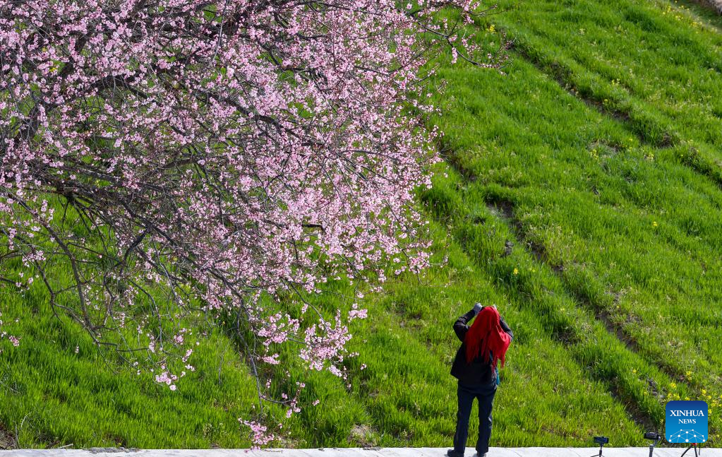 A tourist takes photos of peach blossoms in Suosong Village in Nyingchi, southwest China's Tibet Autonomous Region, April 5, 2023. (Xinhua/Jiang Fan)