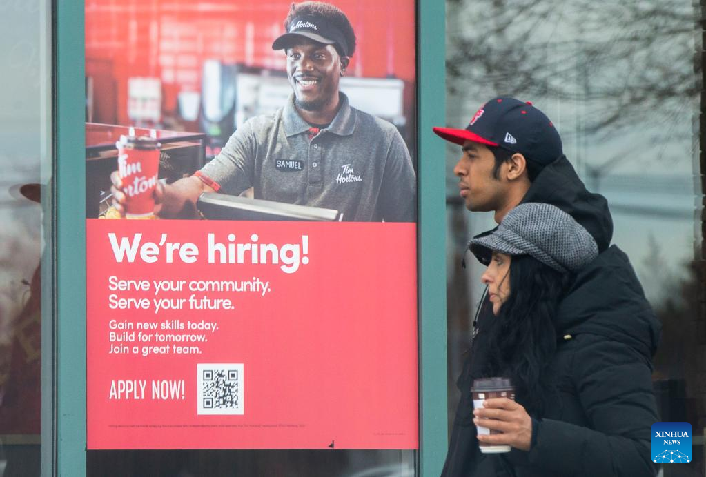 People walk past a job poster outside a store in Oakville, Ontario, Canada, on April 6, 2023. Canada's employment grew by 35,000, or 0.2 percent, in March, following little change in February and strong growth in January and December, Statistics Canada said on Thursday. (Photo by Zou Zheng/Xinhua)