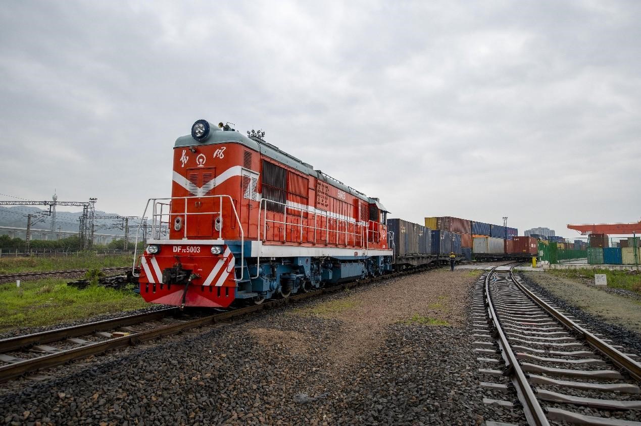 A fully loaded China-Europe freight train departs from Yiwu, east China's Zhejiang province, for Central Asian countries, April 4, 2023. (People's Daily Online/Hu Xiaofei)