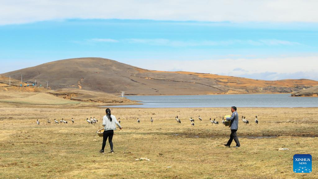 KUNMING, April 6 (Xinhua) -- The local villagers in the city of Zhaotong of southwest China's Yunnan Province view the black-necked crane as auspicious birds, and many, along with professional staff, volunteer to keep them fit and healthy ahead of their northward migration each spring.