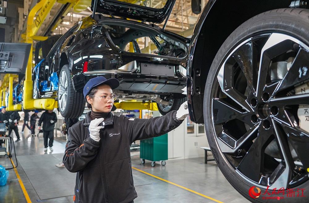 Photo shows a worker in a factory of Zeekr, a Chinese EV maker, in Ningbo city, east China's Zhejiang Province. (People's Daily Online/Zhang Yongtao)