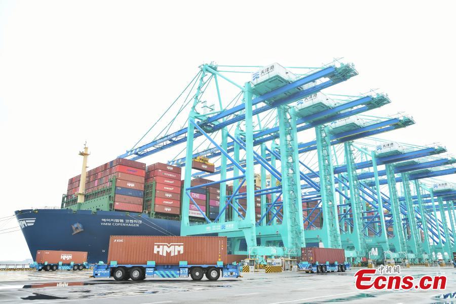 Drone photo shows a container ship loads containers at Tianjin Port, April 6, 2023. (Photo: China News Service/Tong Yu)