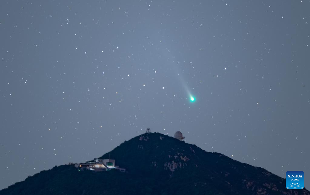 This photomontage taken on Dec. 7, 2021 shows a comet streaking across the night sky over Shenzhen, south China's Guangdong Province. (Photo by Zeng Yuepeng/Xinhua)