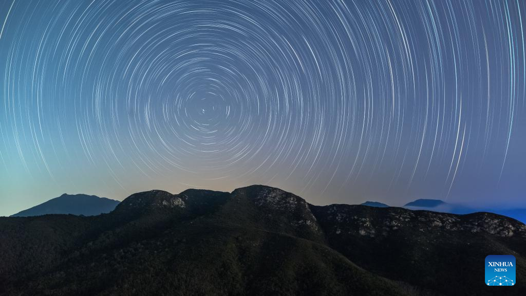 This photomontage taken on April 6, 2023 shows the star trails above Xichong community in Shenzhen, south China's Guangdong Province. (Photo by Li Delai/Xinhua)