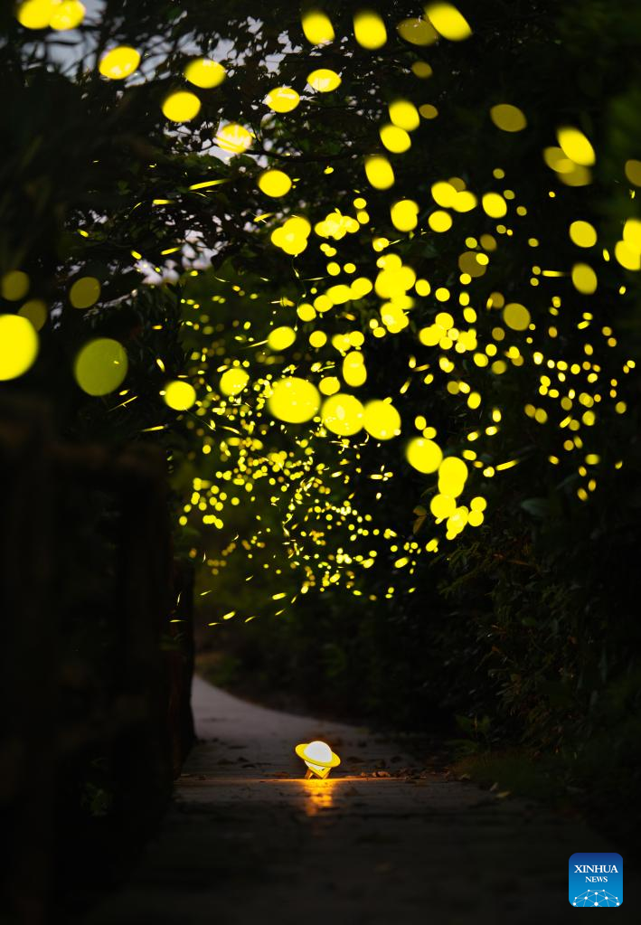 This photomontage taken on June 11, 2022 shows flying fireflies in dark at Xichong community in Shenzhen, south China's Guangdong Province. (Photo by Zeng Yuepeng/Xinhua)