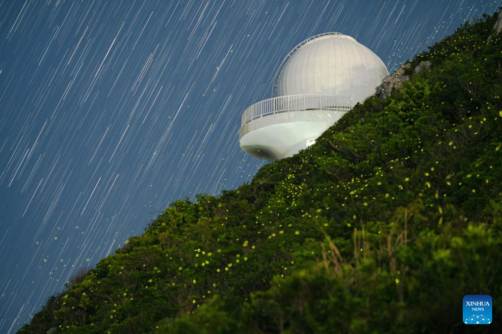 This photomontage taken on July 7, 2021 shows the Shenzhen Astronomical Observatory and flying fireflies in Shenzhen, south China's Guangdong Province. (Photo by Zeng Yuepeng/Xinhua)