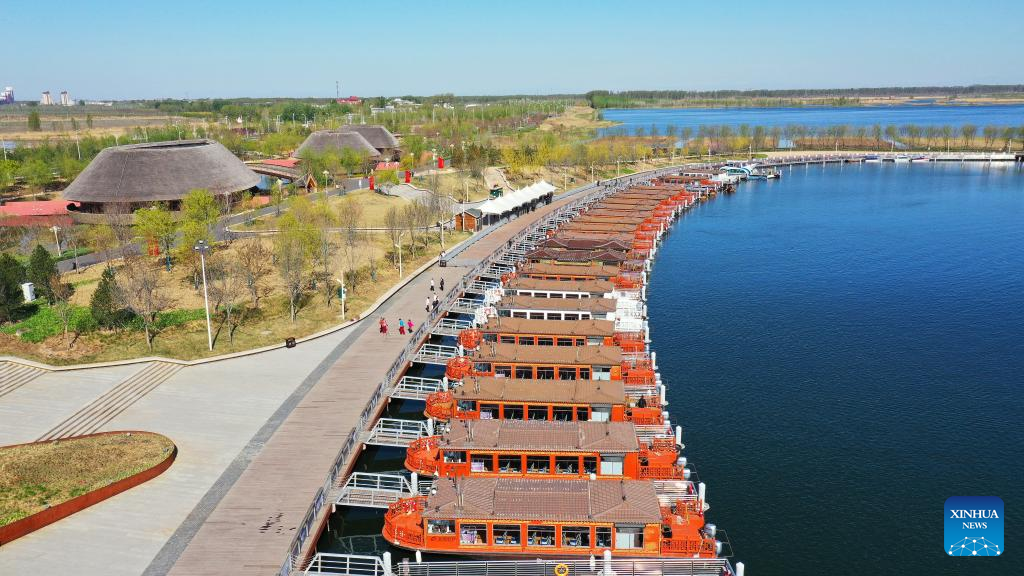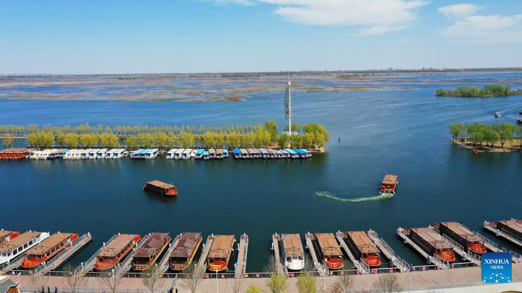 This aerial photo taken on April 7, 2023 shows vessels moored at a tourist wharf during the trial operation of the Baiyangdian Lake water bus service in Xiong'an New Area, north China's Hebei Province. The Baiyangdian Lake water bus service is currently in trial operation and will soon be officially launched. The service features 100 vessels powered by liquefied petroleum gas (LPG), which are more cost-efficient and environmentally friendly than oil-fueled boats. Visitors can also take traditional wooden boats which offer an alternative way of touring the Baiyangdian Lake. (Xinhua/Mu Yu)
