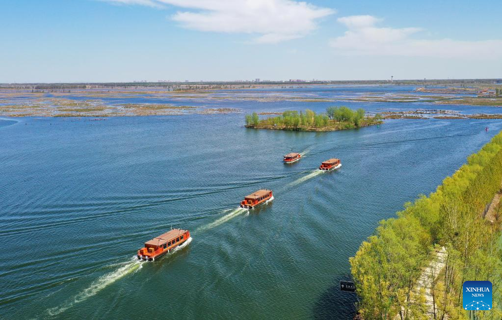 This aerial photo taken on April 7, 2023 shows vessels cruising during the trial operation of the Baiyangdian Lake water bus service in Xiong'an New Area, north China's Hebei Province. The Baiyangdian Lake water bus service is currently in trial operation and will soon be officially launched. The service features 100 vessels powered by liquefied petroleum gas (LPG), which are more cost-efficient and environmentally friendly than oil-fueled boats. Visitors can also take traditional wooden boats which offer an alternative way of touring the Baiyangdian Lake. (Xinhua/Mu Yu)