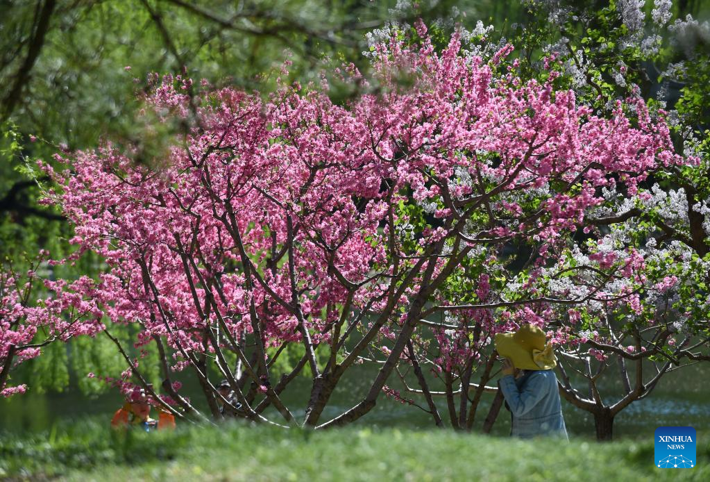 A tourist takes photos at Taoranting park during good weather in Beijing, capital of China, April 7, 2023. (Xinhua/Luo Xiaoguang)