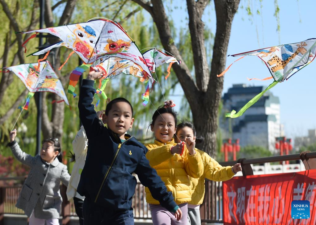 Children fly kites at Taoranting park during good weather in Beijing, capital of China, April 7, 2023. (Xinhua/Luo Xiaoguang)
