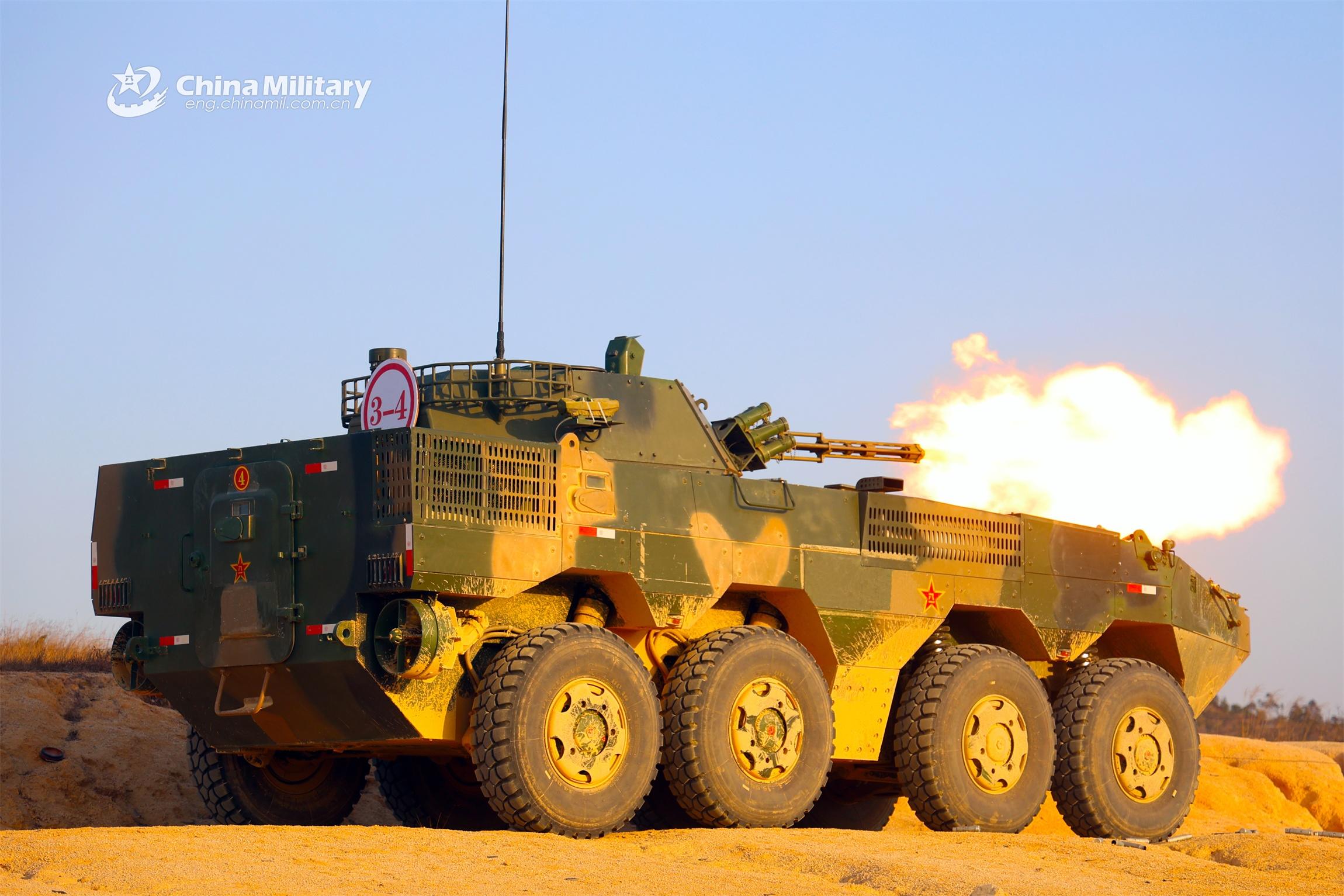 An armored vehicle attached to a brigade of the PLA Navy Marine Corps spits fire at mock targets during a live-fire assessment in early March, 2023. (eng.chinamil.com.cn/Photo by Gao Guojing)