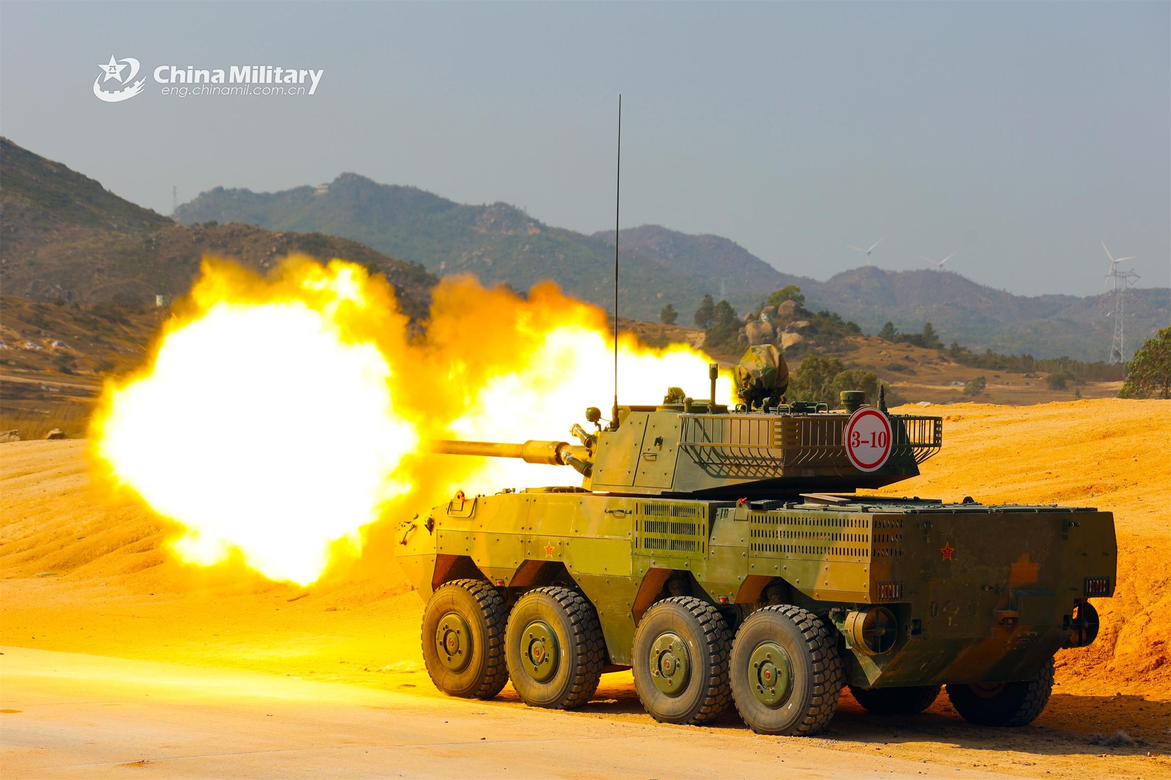 An armored vehicle attached to a brigade of the PLA Navy Marine Corps spits fire at mock targets during a live-fire assessment in early March, 2023. (eng.chinamil.com.cn/Photo by Gao Guojing)