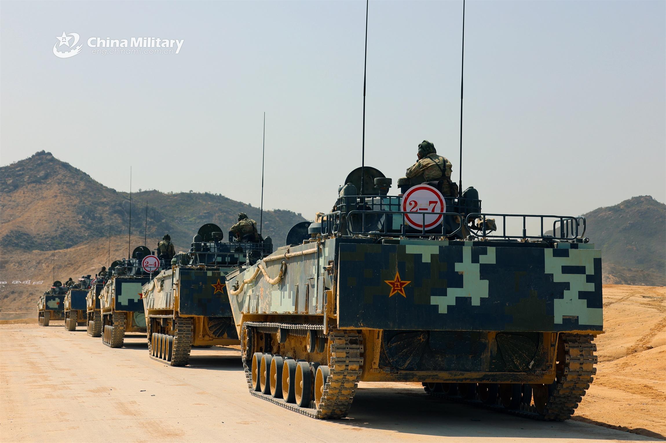 A convoy of armored vehicles attached to a brigade of the PLA Navy Marine Corps maneuvers to a designated area for a live-fire assessment in early March, 2023. (eng.chinamil.com.cn/Photo by Gao Guojing)