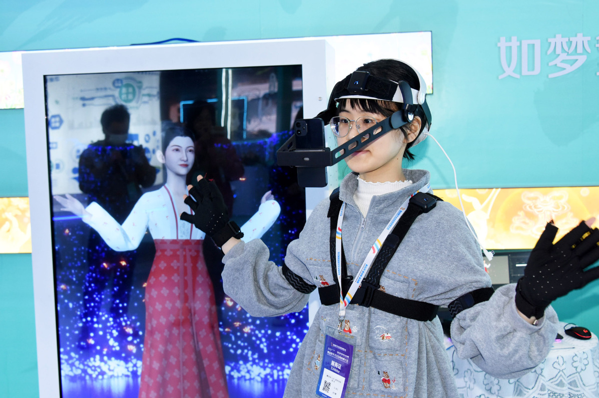 A staff member showcases virtual Han-style clothing at the 2023 Qingdao Digital Culture Application Development Expo in Qingdao, Shandong province, on April 6, 2023. [Photo/Xinhua]