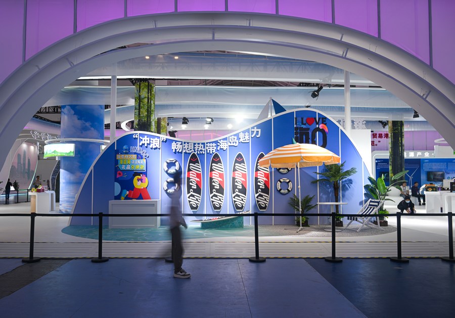 This photo taken on April 8, 2023 shows a booth at Hainan International Convention and Exhibition Center, the venue for the upcoming third China International Consumer Products Expo (CICPE), in Haikou, south China's Hainan Province. (Xinhua/Pu Xiaoxu)