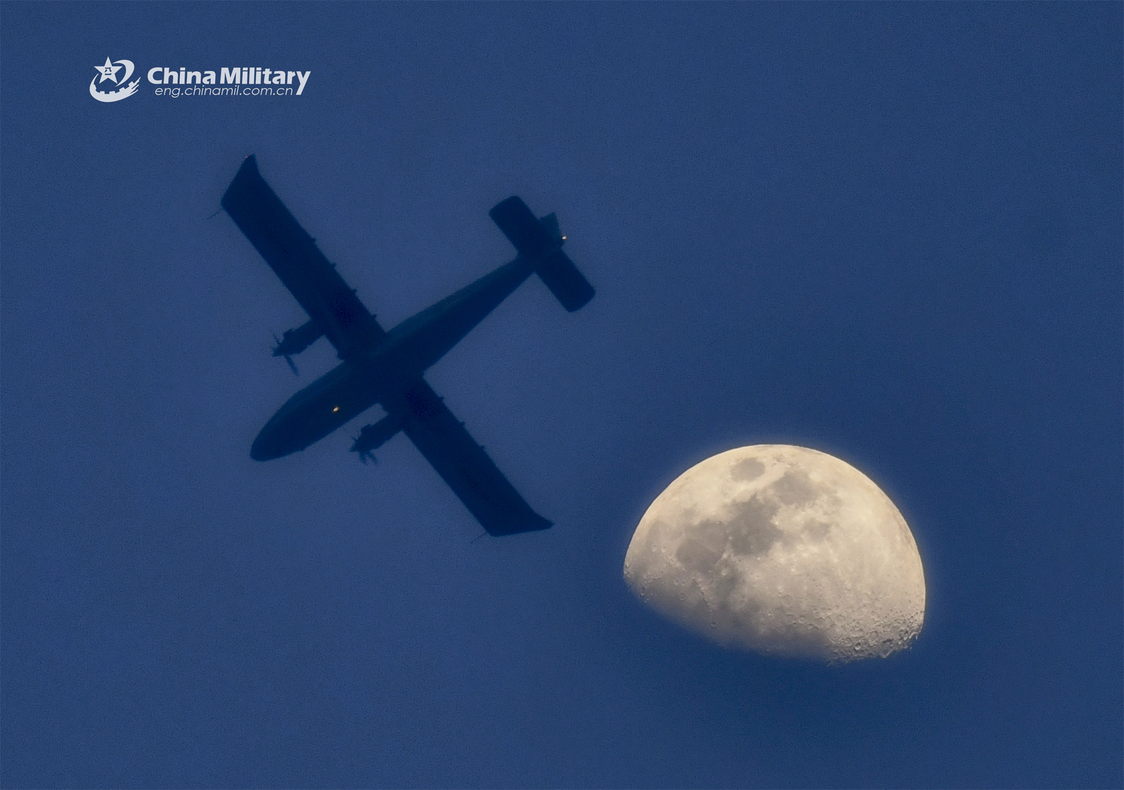 A Y-12 transport aircraft attached to an air transport brigade under the PLA Air Force's airborne troops flies high in moonlight during the intensive round-the-clock flight training recently. (eng.chinamil.com.cn/Photo by Li Zhuojun)