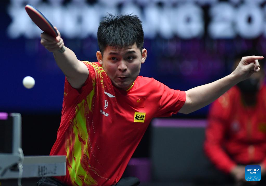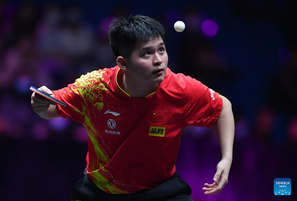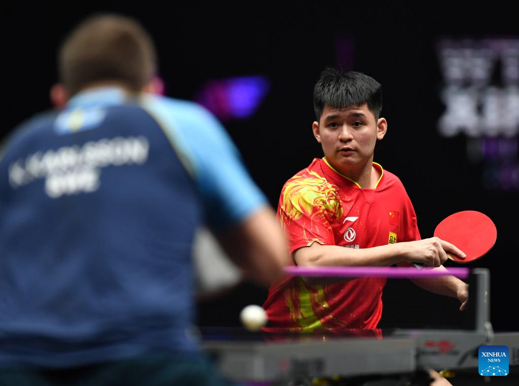 Lin Shidong of China hits a return during the men's singles round of 32 match against Kristian Karlsson of Sweden at the WTT Champions Xinxiang 2023 in Xinxiang, central China's Henan Province, April 9, 2023. (Xinhua/Li Jianan)