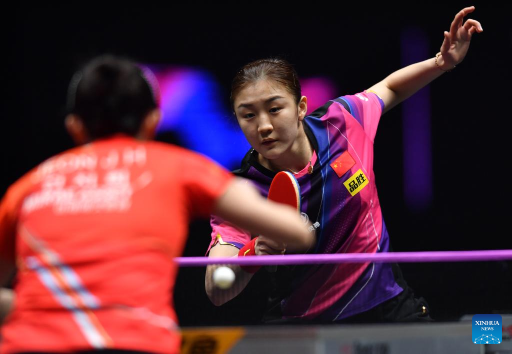 Chen Meng (R) of China hits a return during the women's singles round of 32 match against Jeon Jihee of South Korea at the WTT Champions Xinxiang 2023 in Xinxiang, central China's Henan Province, April 9, 2023. (Xinhua/Li Jianan)