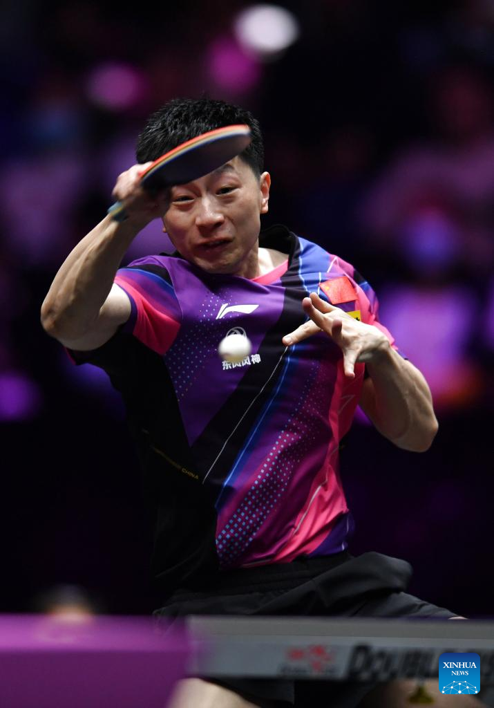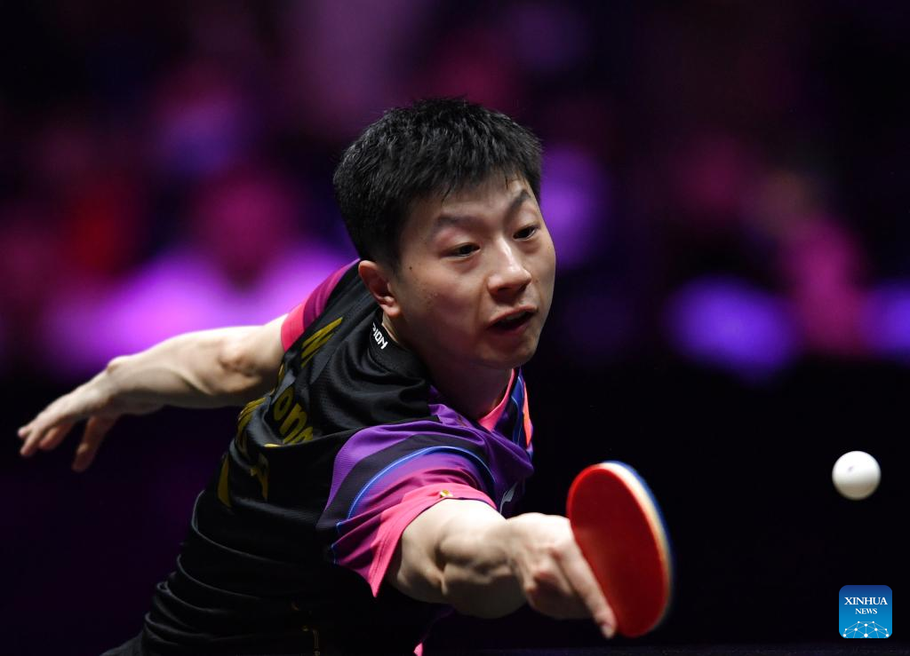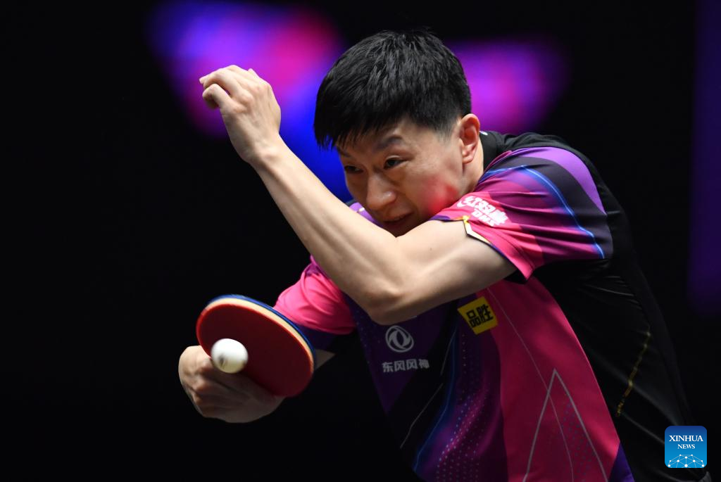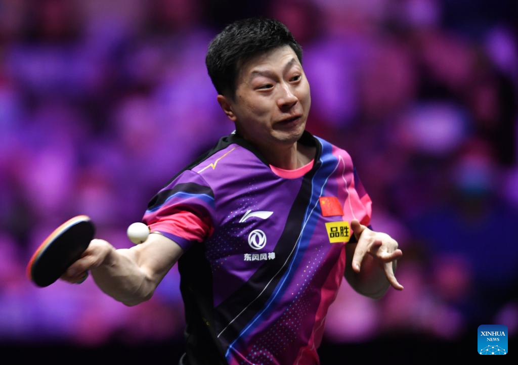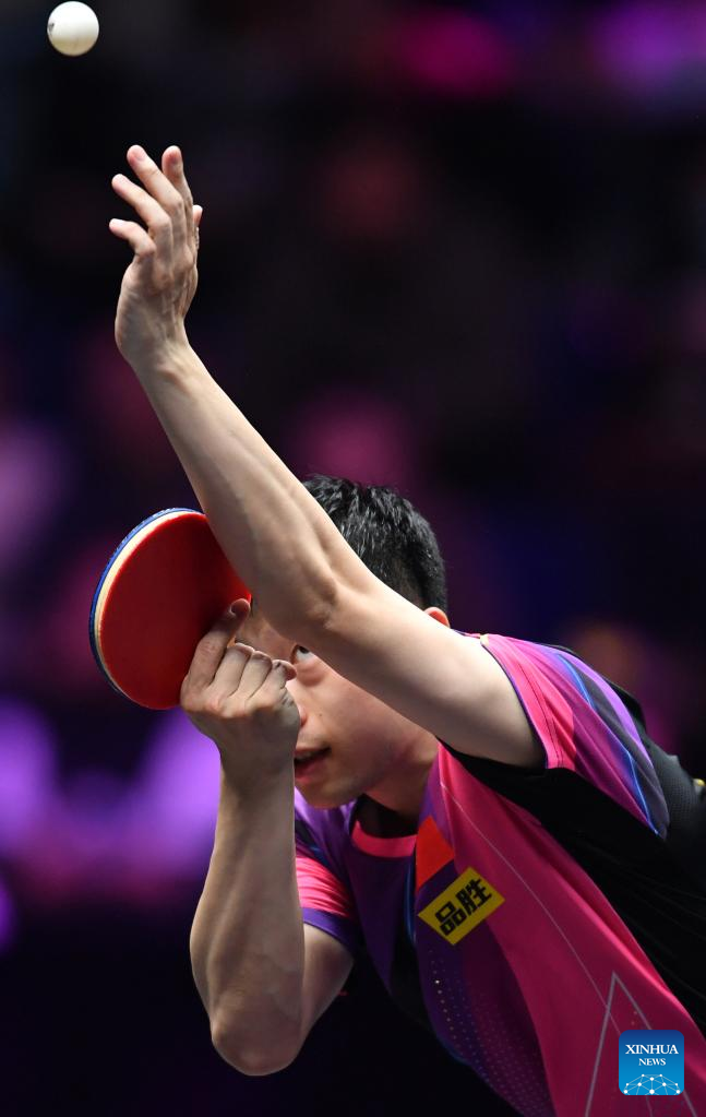 Ma Long of China hits a return during the men's singles round of 32 match against Anton Kallberg of Sweden at the WTT Champions Xinxiang 2023 in Xinxiang, central China's Henan Province, April 9, 2023. (Xinhua/Li Jianan)