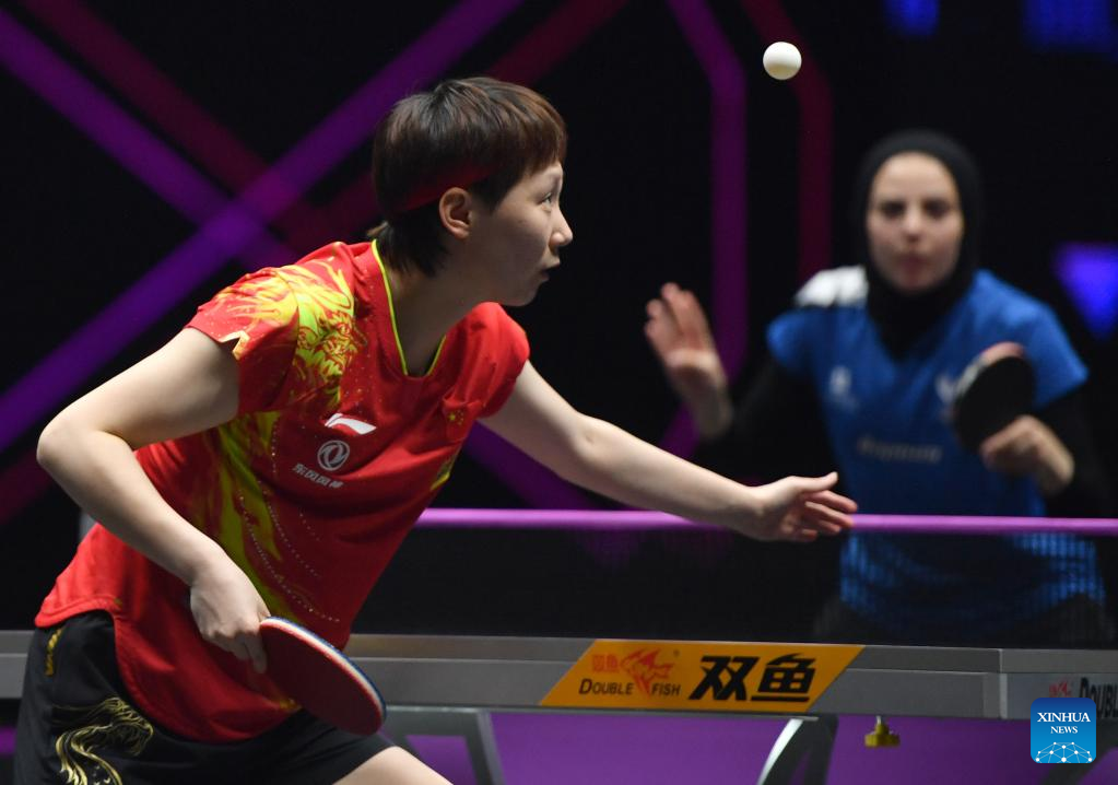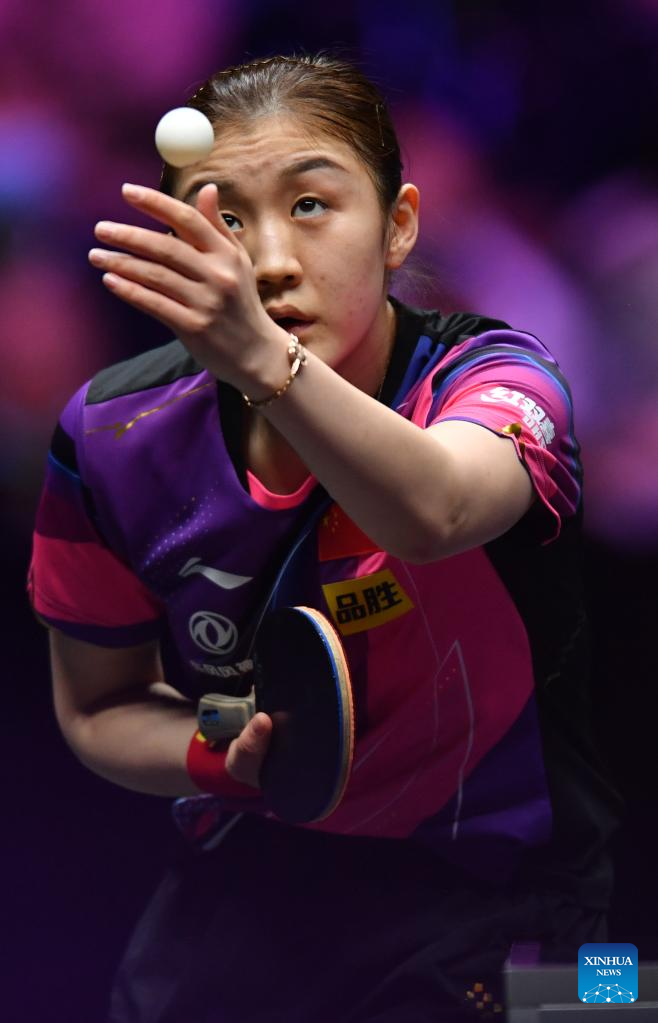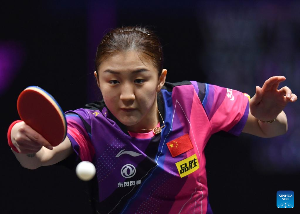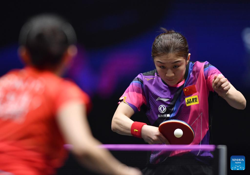 Wang Manyu of China hits a return during the women's singles round of 32 match against Dina Meshref of Egypt at the WTT Champions Xinxiang 2023 in Xinxiang, central China's Henan Province, April 9, 2023. (Xinhua/Li Jianan)