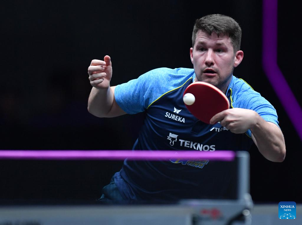 Kristian Karlsson of Sweden hits a return during the men's singles round of 32 match against Lin Shidong of China at the WTT Champions Xinxiang 2023 in Xinxiang, central China's Henan Province, April 9, 2023. (Xinhua/Li Jianan)