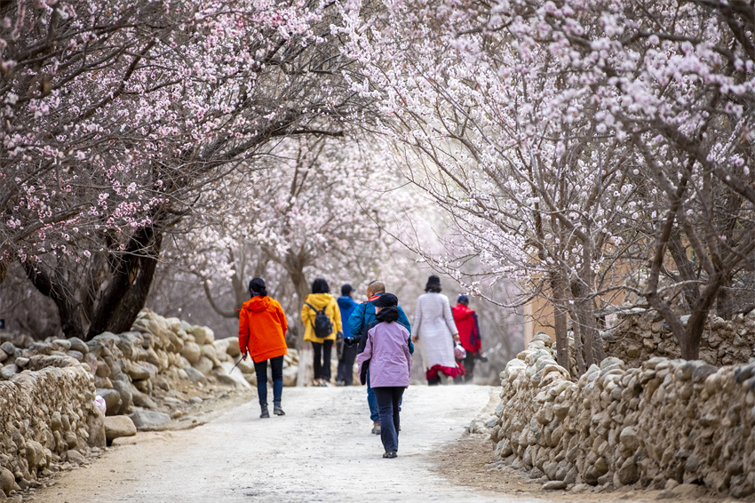 Tourists go sightseeing amid blooming apricot flowers in the Tar Tajik township of Akto county, nestled in the hinterlands of the Kunlun Mountains in northwest China's Xinjiang Uygur Autonomous Region. (Photo/Xie Zhi)