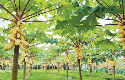 Photo shows golden papaya trees at a fruit planting base of the “Window of the World’s Tropical Fruits,” a modern agricultural industrial park in Dalu township, Qionghai city, south China’s Hainan Province. (Photo courtesy of the interviewee)
