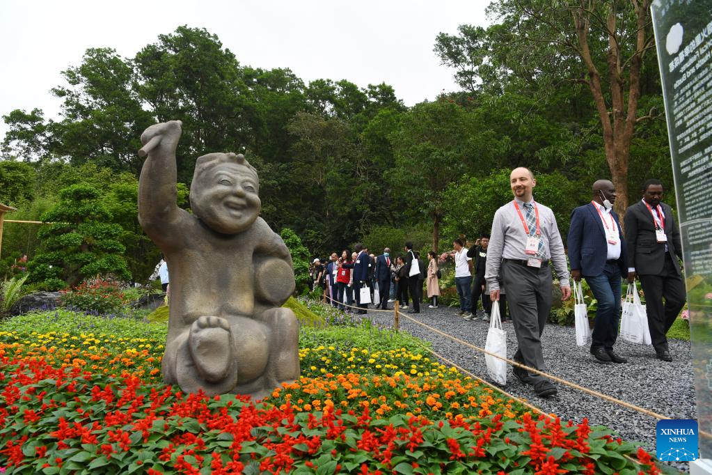 A guest looks at a statue at the Greater Bay Area Flower Show in Shenzhen, south China's Guangdong Province, April 8, 2023. The 10-day flower show was opened at Shenzhen Fairy Lake Botanical Garden on Saturday, attracting 80 exhibitors from 13 countries and regions including Australia, Britain, France, Japan, South Korea and the United States. (Xinhua/Liang Xu)