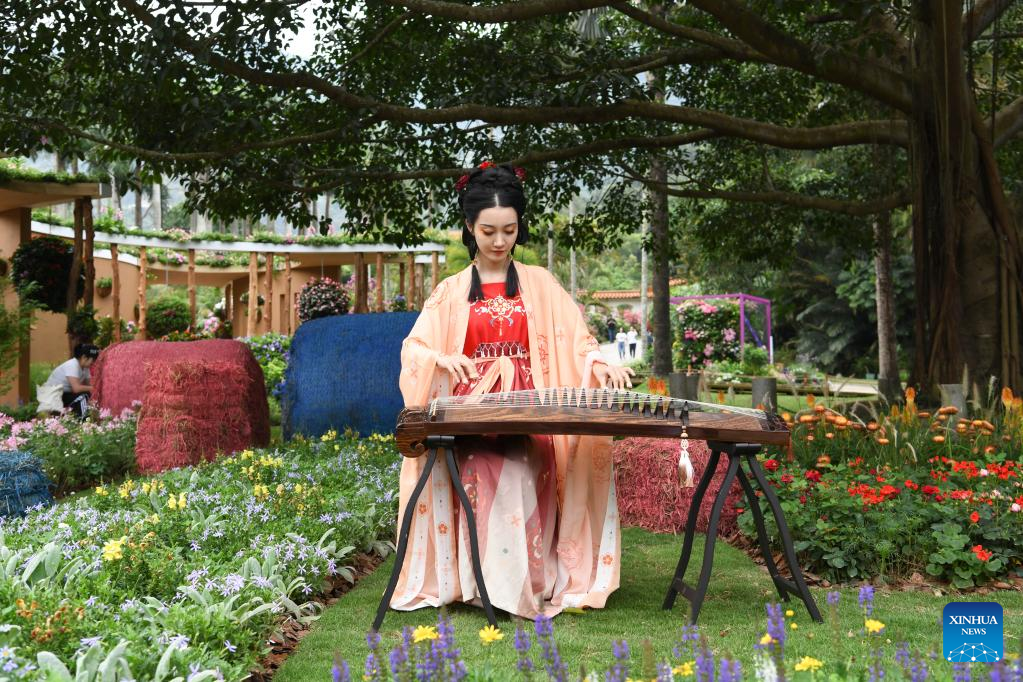 A performer plays a Chinese traditional musical instrument at the Greater Bay Area Flower Show in Shenzhen, south China's Guangdong Province, April 8, 2023. The 10-day flower show was opened at Shenzhen Fairy Lake Botanical Garden on Saturday, attracting 80 exhibitors from 13 countries and regions including Australia, Britain, France, Japan, South Korea and the United States. (Xinhua/Liang Xu)