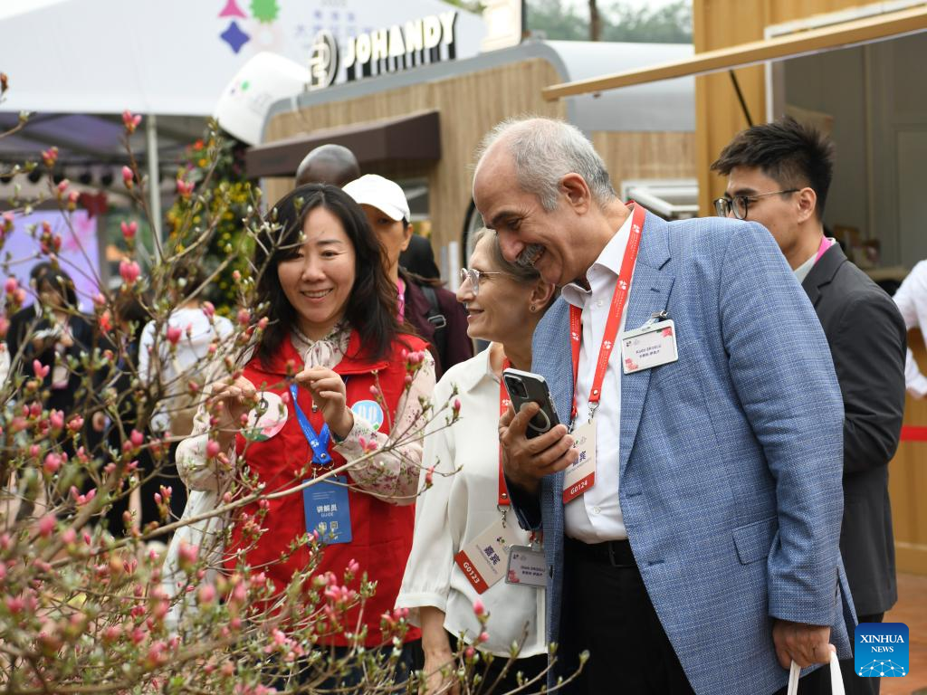 Guests enjoy flowers at the Greater Bay Area Flower Show in Shenzhen, south China's Guangdong Province, April 8, 2023. The 10-day flower show was opened at Shenzhen Fairy Lake Botanical Garden on Saturday, attracting 80 exhibitors from 13 countries and regions including Australia, Britain, France, Japan, South Korea and the United States. (Xinhua/Liang Xu)