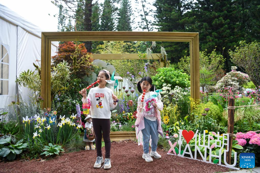Children pose for photos at the Greater Bay Area Flower Show in Shenzhen, south China's Guangdong Province, April 8, 2023. The 10-day flower show was opened at Shenzhen Fairy Lake Botanical Garden on Saturday, attracting 80 exhibitors from 13 countries and regions including Australia, Britain, France, Japan, South Korea and the United States. (Xinhua/Liang Xu)
