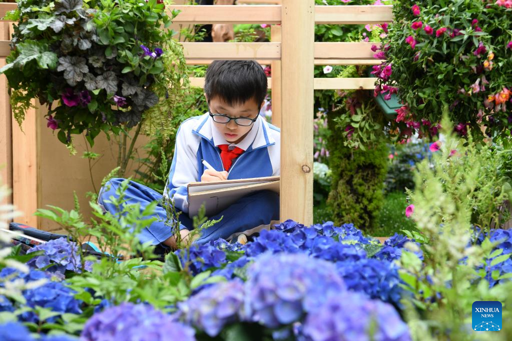 A boy makes a sketch of flowers at the Greater Bay Area Flower Show in Shenzhen, south China's Guangdong Province, April 8, 2023. The 10-day flower show was opened at Shenzhen Fairy Lake Botanical Garden on Saturday, attracting 80 exhibitors from 13 countries and regions including Australia, Britain, France, Japan, South Korea and the United States. (Xinhua/Liang Xu)