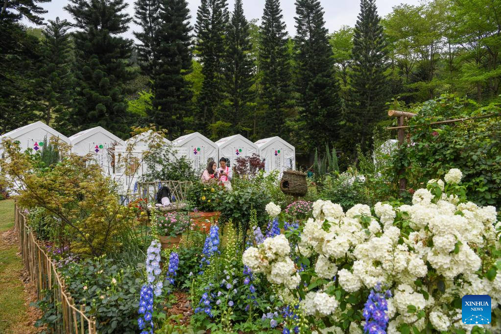 Visitors enjoy themselves at the Greater Bay Area Flower Show in Shenzhen, south China's Guangdong Province, April 8, 2023. The 10-day flower show was opened at Shenzhen Fairy Lake Botanical Garden on Saturday, attracting 80 exhibitors from 13 countries and regions including Australia, Britain, France, Japan, South Korea and the United States. (Xinhua/Liang Xu)