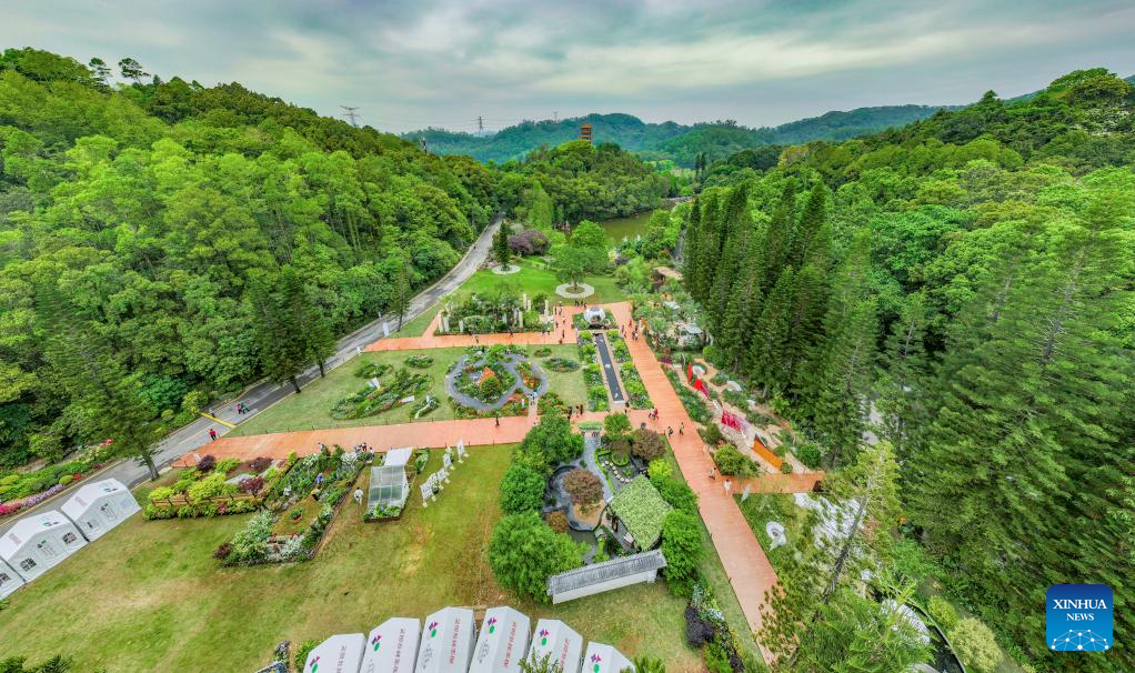 This aerial photo taken on April 8, 2023 shows a view of the Greater Bay Area Flower Show in Shenzhen, south China's Guangdong Province. The 10-day flower show was opened at Shenzhen Fairy Lake Botanical Garden on Saturday, attracting 80 exhibitors from 13 countries and regions including Australia, Britain, France, Japan, South Korea and the United States. (Photo by Zhong Zijie/Xinhua)
