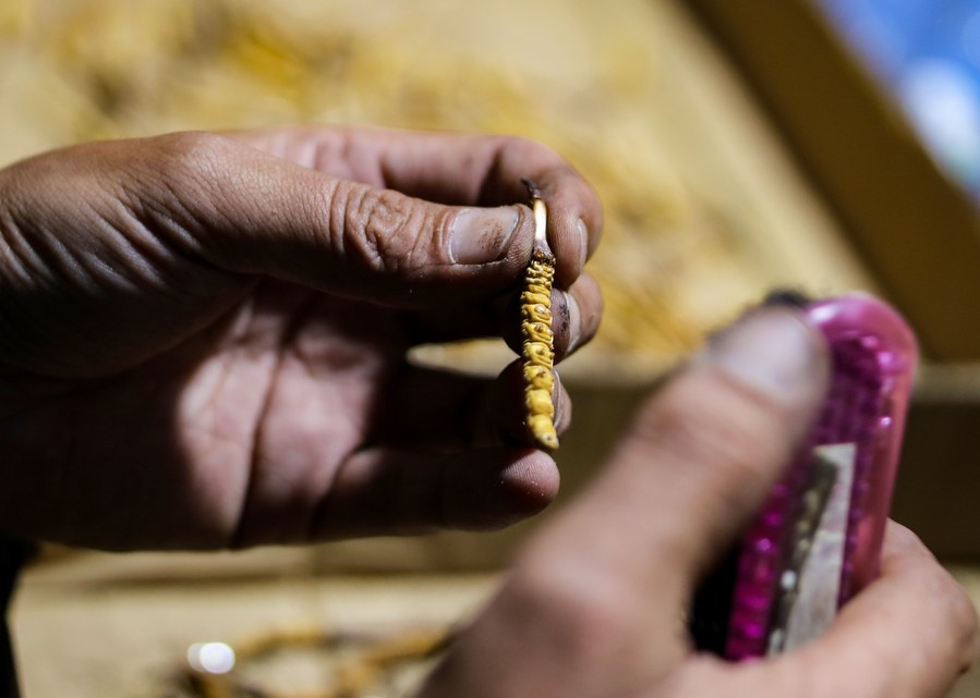 A herdsman cleans a newly-harvested caterpillar fungus at a caterpillar fungus collecting site in Lainqu Township, Biru County of Nagqu, southwest China's Tibet Autonomous Region, May 25, 2022. (Xinhua/Jiang Fan)