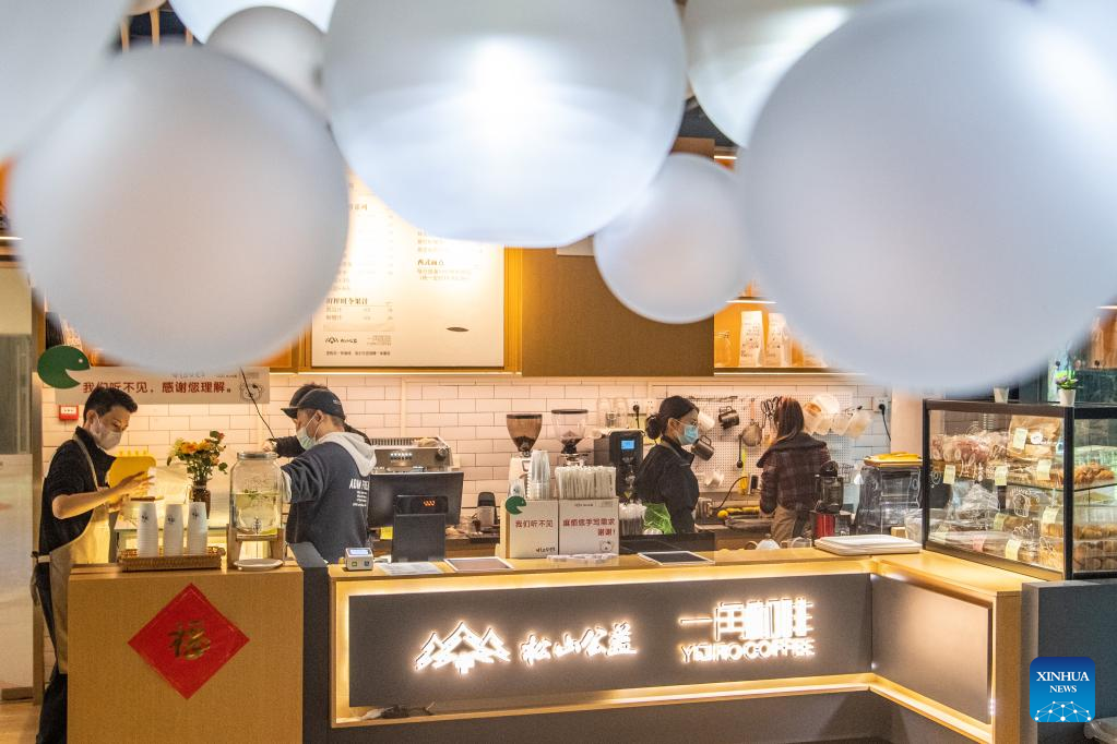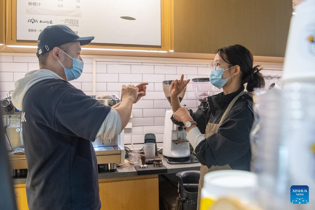Hearing-impaired baristas work in a coffee shop located at Songshan General Hospital, Yubei District of southwest China's Chongqing Municipality, March 29, 2023. (Xinhua/Tang Yi)