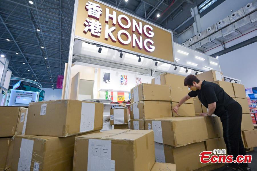 An exhibitor from the Hong Kong Special Administrative Region arranges products for the forthcoming for the 3rd CICPE in Haikou, south China's Hainan Province, April 8, 2023. (Photo: China News Service/Luo Yunfei)