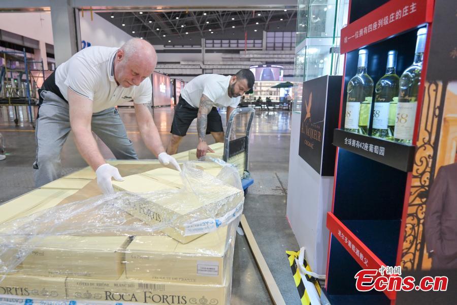 An exhibitor from France arranges products for the forthcoming 3rd CICPE in Haikou, south China's Hainan Province, April 8, 2023. (Photo: China News Service/Luo Yunfei)