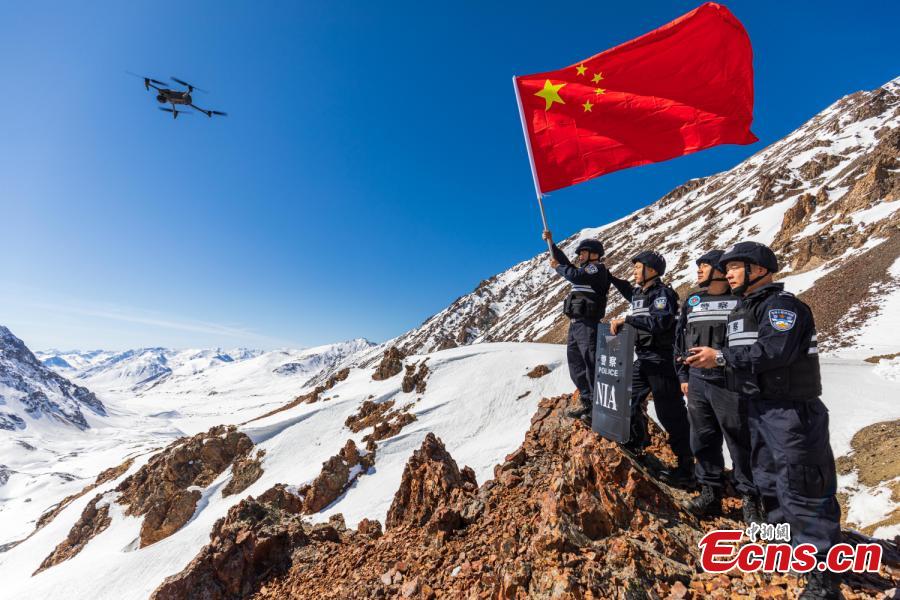 Police officers fly a drone to patrol the border area on a snow-covered mountain in northwest China's Xinjiang Uygur Autonomous Region, April 9, 2023. (Photo: China News Service/Lv Zhiheng)