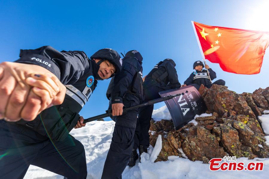 Police officers walk hand-in-hand on a snow-covered mountain to patrol the border area more than 3,600 above sea level in northwest China's Xinjiang Uygur Autonomous Region, April 9, 2023. (Photo: China News Service/Lv Zhiheng)