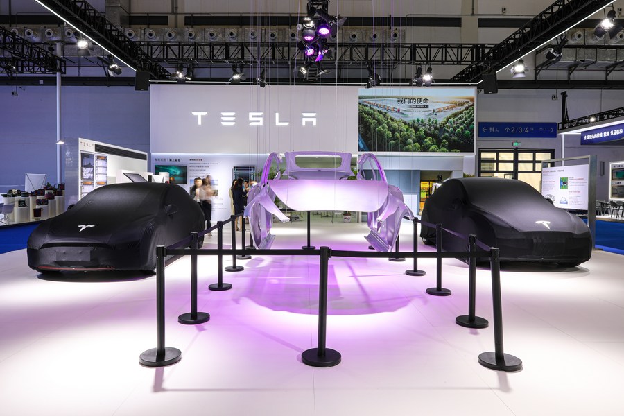 This photo taken on April 10, 2023 shows the booth of Tesla at the third China International Consumer Products Expo (CICPE) in Haikou, capital city of south China's Hainan Province. (Xinhua/Pu Xiaoxu)