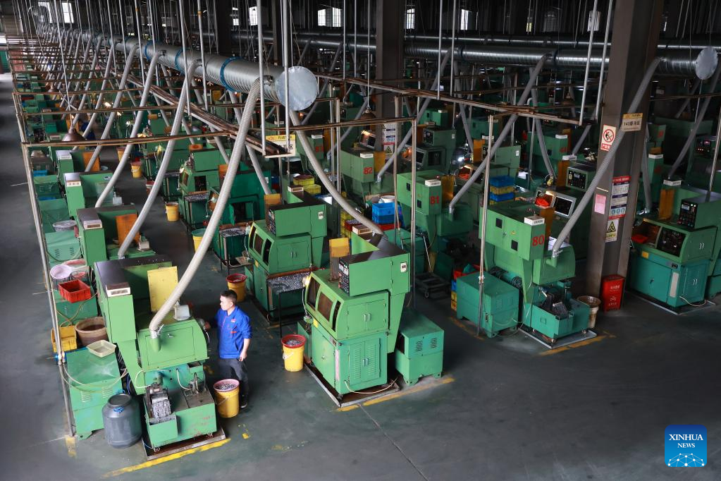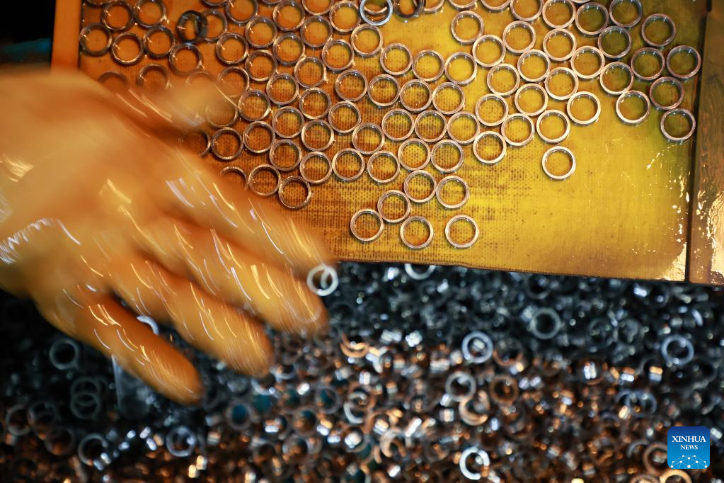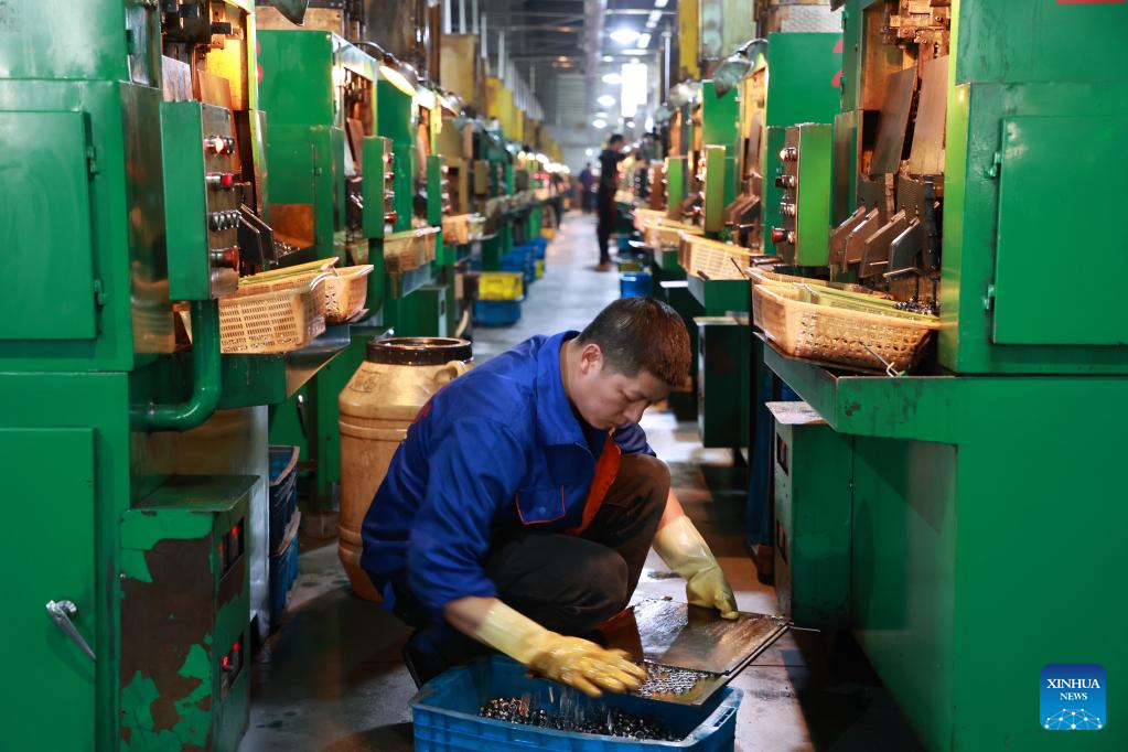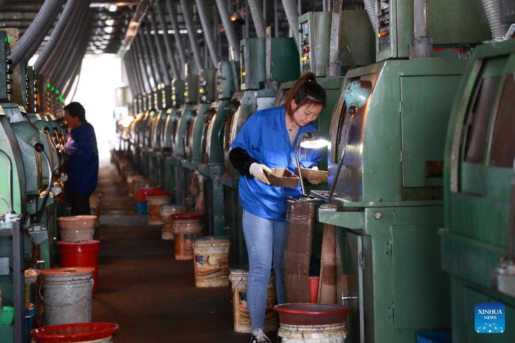 A worker smears lubricating oil onto bearing products at a bearing industry park near Wangcheng community in Dushan County, southwest China's Guizhou Province, April 10, 2023. The local government of Dushan County has been striving to develop its bearing industry in recent years. A bearing industry park was set up near the poverty-relief relocation site and Dushan has drawn up policies involving employment and training to improve the resettled people's livelihood. (Xinhua/Liu Xu)