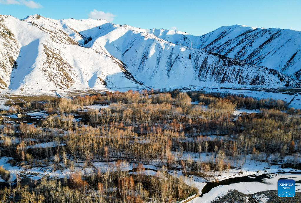 This aerial photo taken on April 9, 2023 shows the scenery of the Altay Mountains at Koktokay scenic area in Fuyun County, northwest China's Xinjiang Uygur Autonomous Region. Koktokay in Xinjiang is rich in tourism resources. The international ski resort in Koktokay is very popular among tourists, which attracts snow lovers from all over the world to ski and enjoy the snow here. According to the ski resort, more than 128,000 visitors have visited the resort since March 2023. (Xinhua/Hu Huhu)