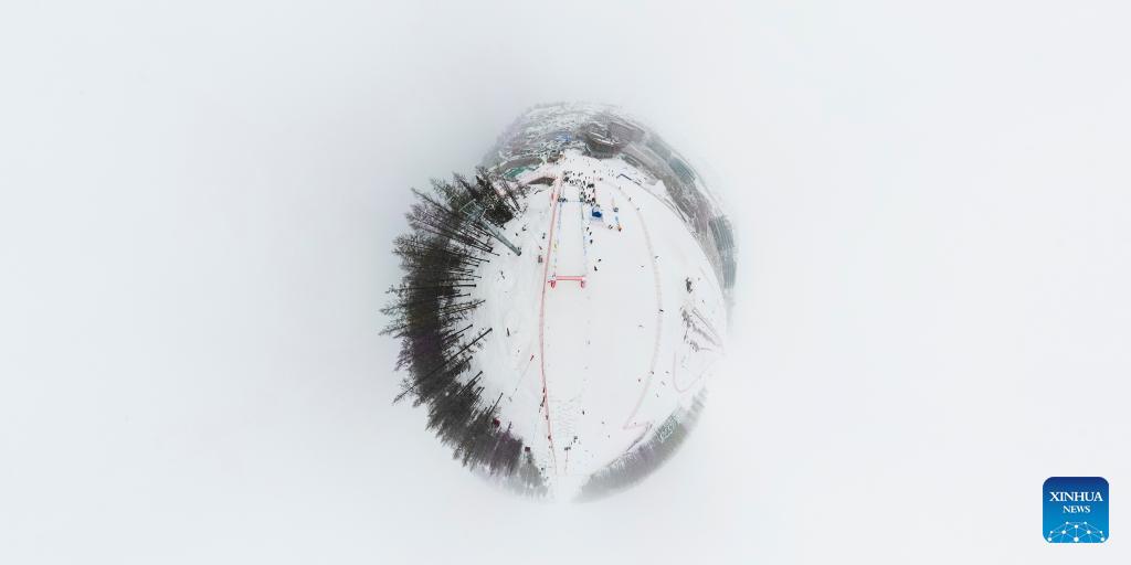 This aerial panorama photo taken on April 8, 2023 shows an international ski resort in Koktokay, Fuyun County, northwest China's Xinjiang Uygur Autonomous Region. Koktokay in Xinjiang is rich in tourism resources. The international ski resort in Koktokay is very popular among tourists, which attracts snow lovers from all over the world to ski and enjoy the snow here. According to the ski resort, more than 128,000 visitors have visited the resort since March 2023. (Xinhua/Hao Zhao)