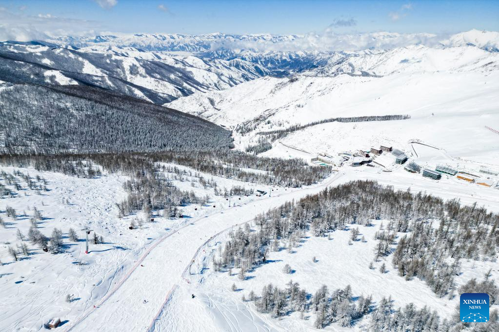 This aerial photo taken on April 9, 2023 shows an international ski resort in Koktokay, Fuyun County, northwest China's Xinjiang Uygur Autonomous Region. Koktokay in Xinjiang is rich in tourism resources. The international ski resort in Koktokay is very popular among tourists, which attracts snow lovers from all over the world to ski and enjoy the snow here. According to the ski resort, more than 128,000 visitors have visited the resort since March 2023. (Xinhua/Hao Zhao)