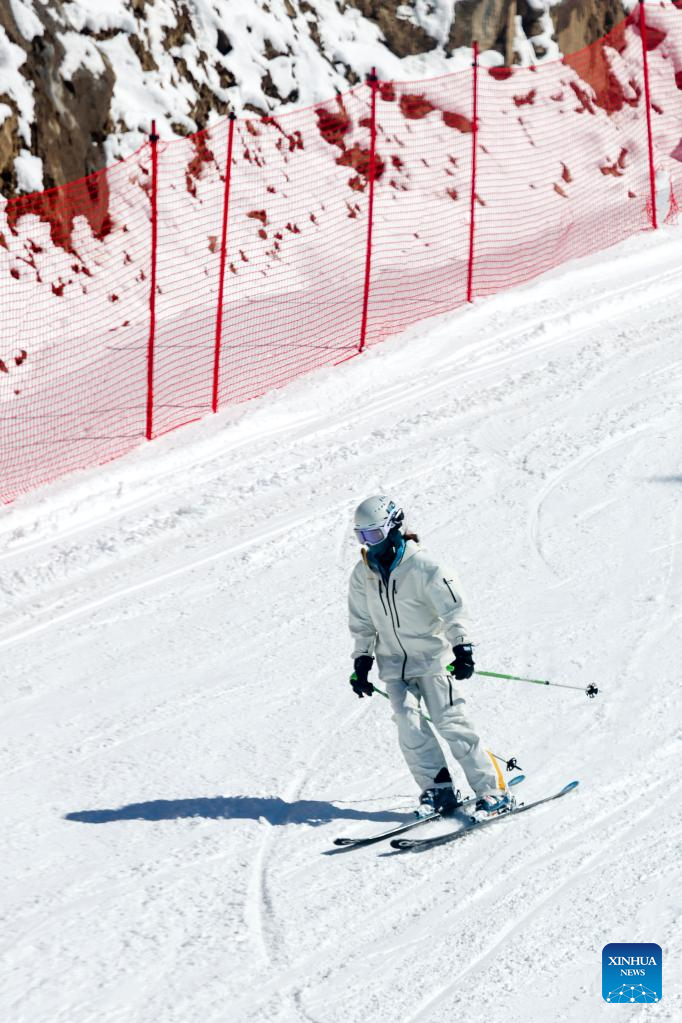 A tourist skis at an international ski resort in Koktokay, Fuyun County, northwest China's Xinjiang Uygur Autonomous Region, April 9, 2023. Koktokay in Xinjiang is rich in tourism resources. The international ski resort in Koktokay is very popular among tourists, which attracts snow lovers from all over the world to ski and enjoy the snow here. According to the ski resort, more than 128,000 visitors have visited the resort since March 2023. (Xinhua/Hao Zhao)