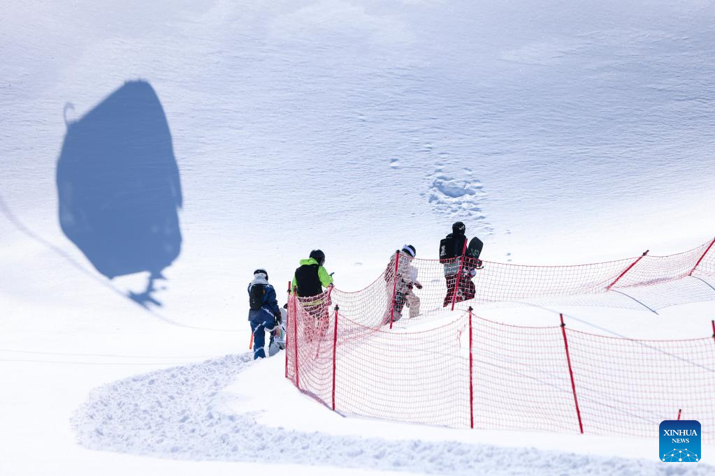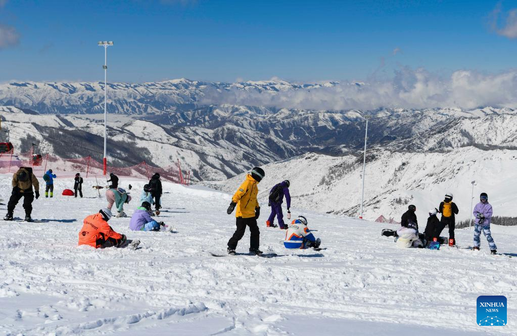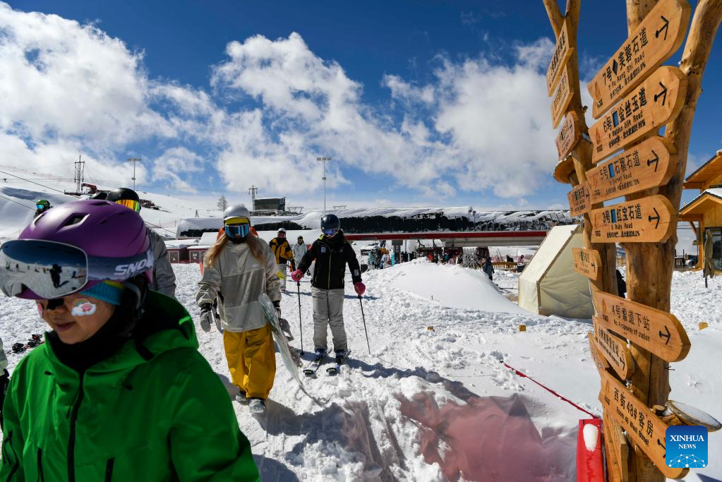 Tourists enjoy themselves at an international ski resort in Koktokay, Fuyun County, northwest China's Xinjiang Uygur Autonomous Region, April 9, 2023. Koktokay in Xinjiang is rich in tourism resources. The international ski resort in Koktokay is very popular among tourists, which attracts snow lovers from all over the world to ski and enjoy the snow here. According to the ski resort, more than 128,000 visitors have visited the resort since March 2023. (Xinhua/Hu Huhu)